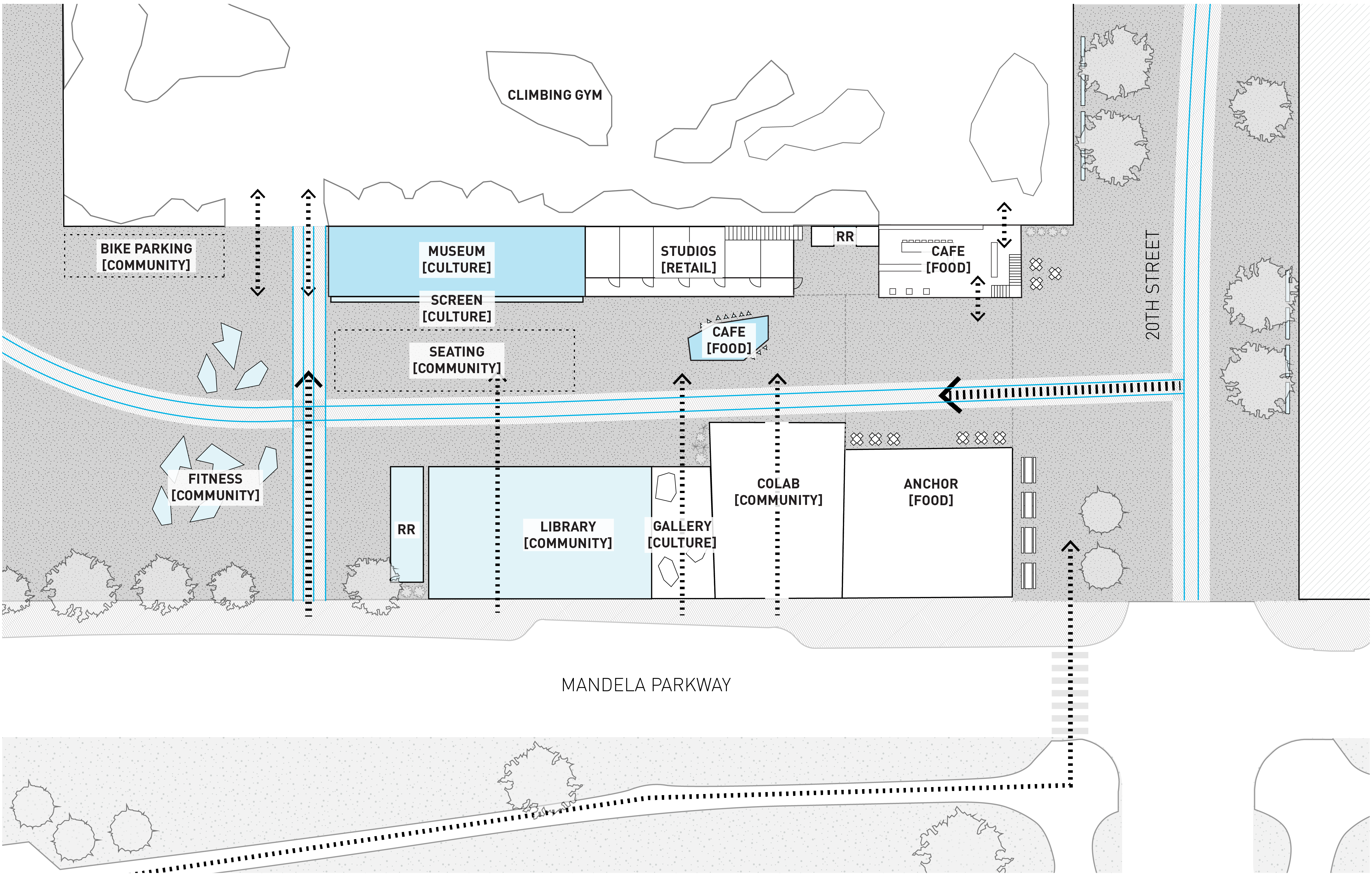 Beginning with a lightweight reoccupation of existing spaces, the project would evolve over time driven by a feedback loop of ongoing community engagement and an involved cohort of tenants and vendors. The West Oakland Gateway would emerge organically, ultimately accommodating a range of permanent uses and users rooted in the neighborhood.